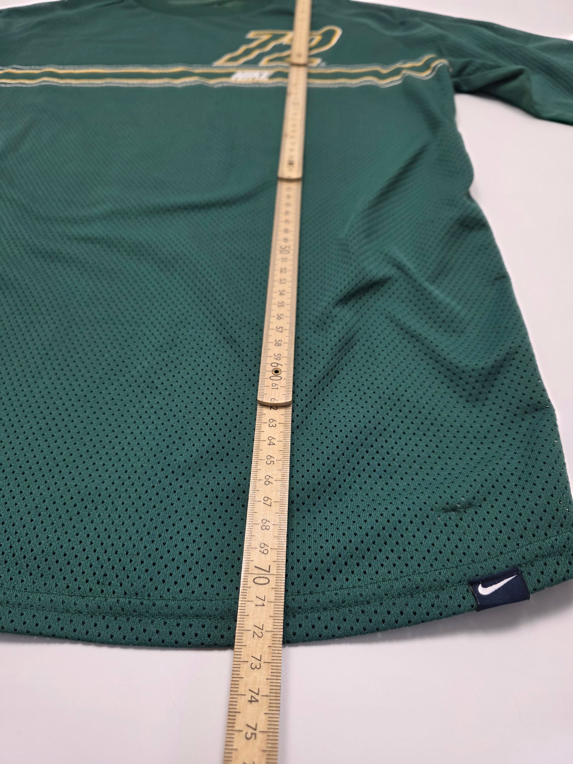 Grünes Nike Piece mit perforierter Struktur, großem „72“-Schriftzug und Streifen-Design auf der Front.